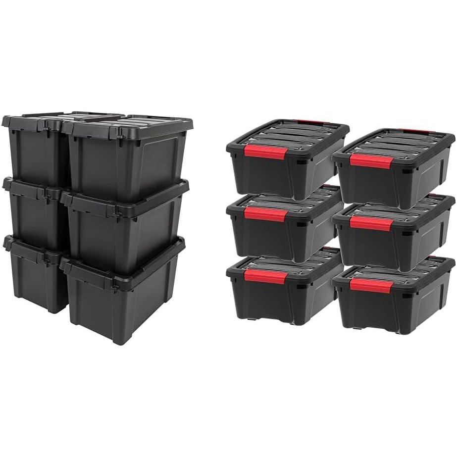 IRIS USA 5 Gallon Lockable Storage Totes with Lids, 6 Pack - Black & USA 12 Quart Stackable Plastic Storage Bins with Lids and Latching Buckles, 6 Pack - Black, Containers with Lids and Latches