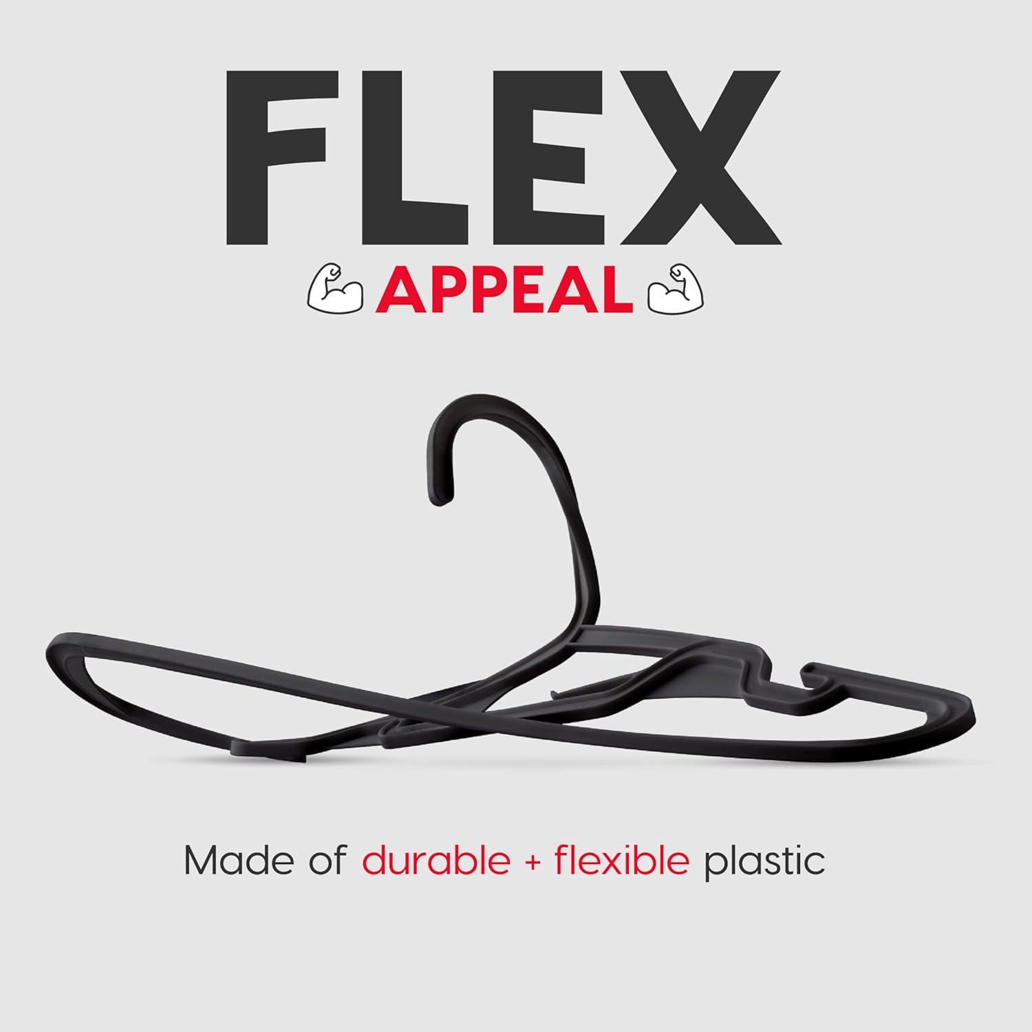 FLEXIBLE & DURABLE HANGERS: The hangers are made from sturdy, flexible plastic and feature shoulder grooves to prevent slipping. Two built-in accessory hooks help keep belts, scarves, and ties tidy and visible.