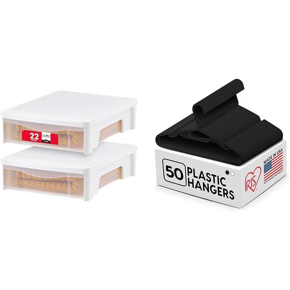 ALL-IN-ONE STORAGE & ORGANIZATION: This IRIS USA bundle includes two 22 Qt underbed storage bins and a 50-pack of durable plastic hangers—perfect for keeping clothing, shoes, and accessories organized in bedrooms, dorms, or closets.