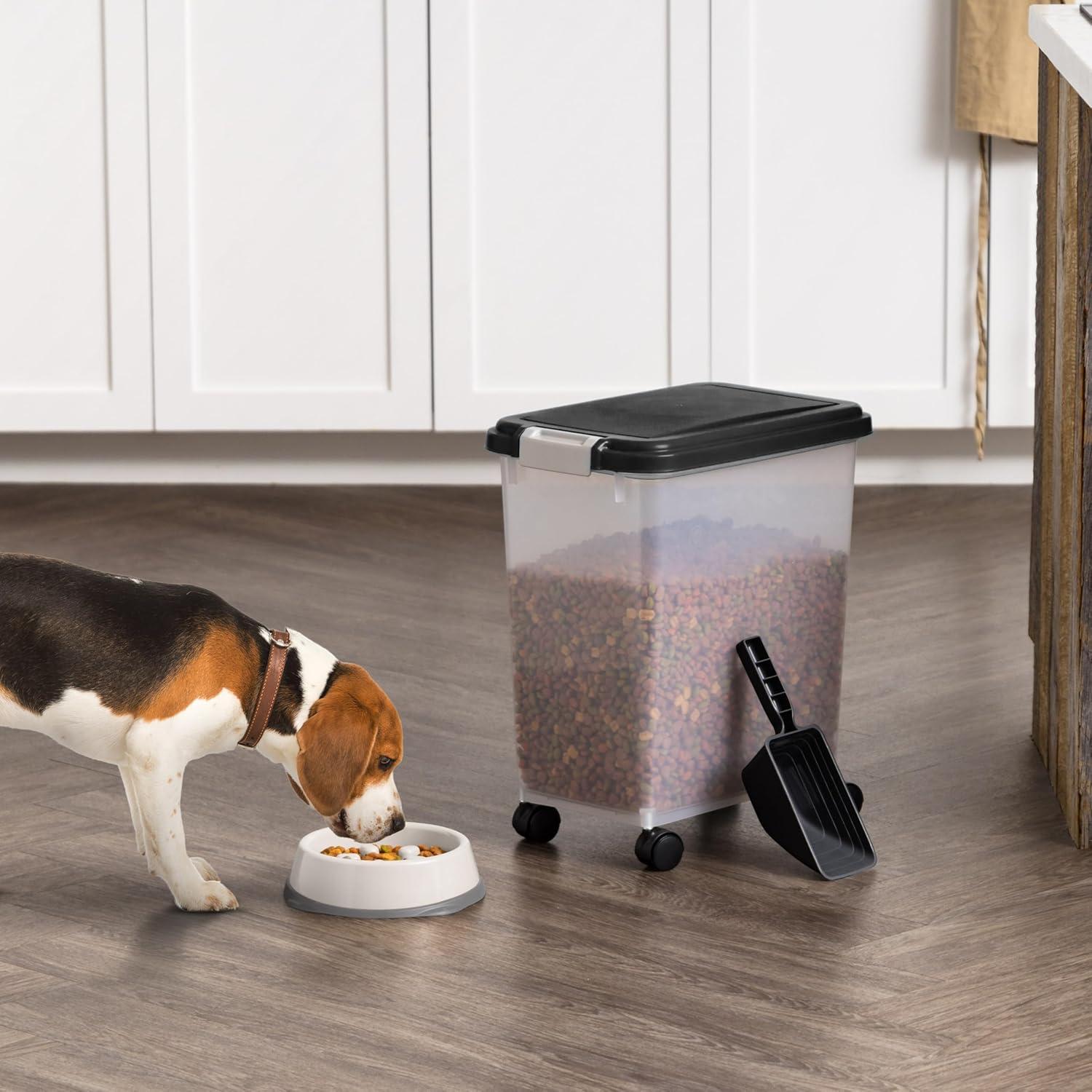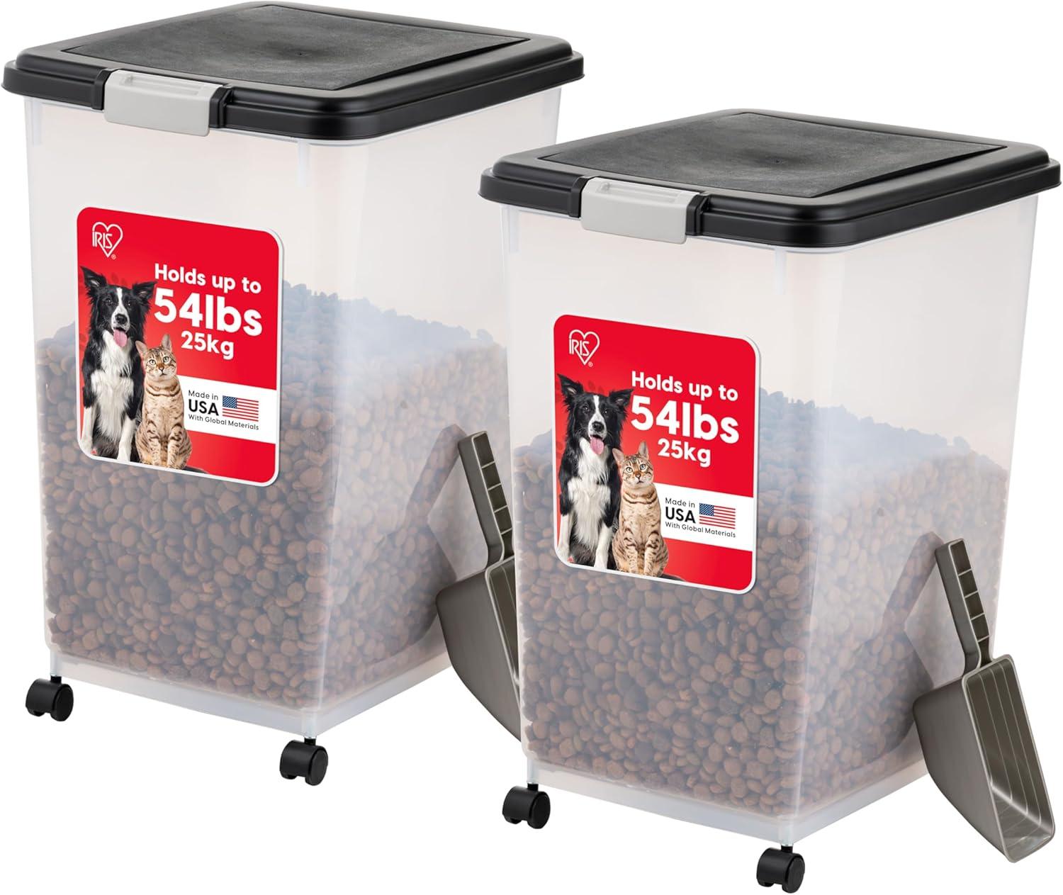 Meet the IRIS Airtight Pet Food Container with Casters designed with your pet in mind. This 69 quart/54 pound sealed storage container with lid is perfect for storing dog food, cat food, or any other pet food you wish to store. The plastic airtight food storage container features a foam seal and snap lock latches to keep contents fresh. Designed as pet food bins, these BPA free rolling storage bins offer many other uses as well, such as leash and toy storage, pellet storage, grain storage, bird seed storage, cat litter storage, or even as a charcoal container. This IRIS Airtight Pet Food Container with Casters is translucent, versatile, functional, and the casters allow for easy mobility in any area of the house. Made in the USA.