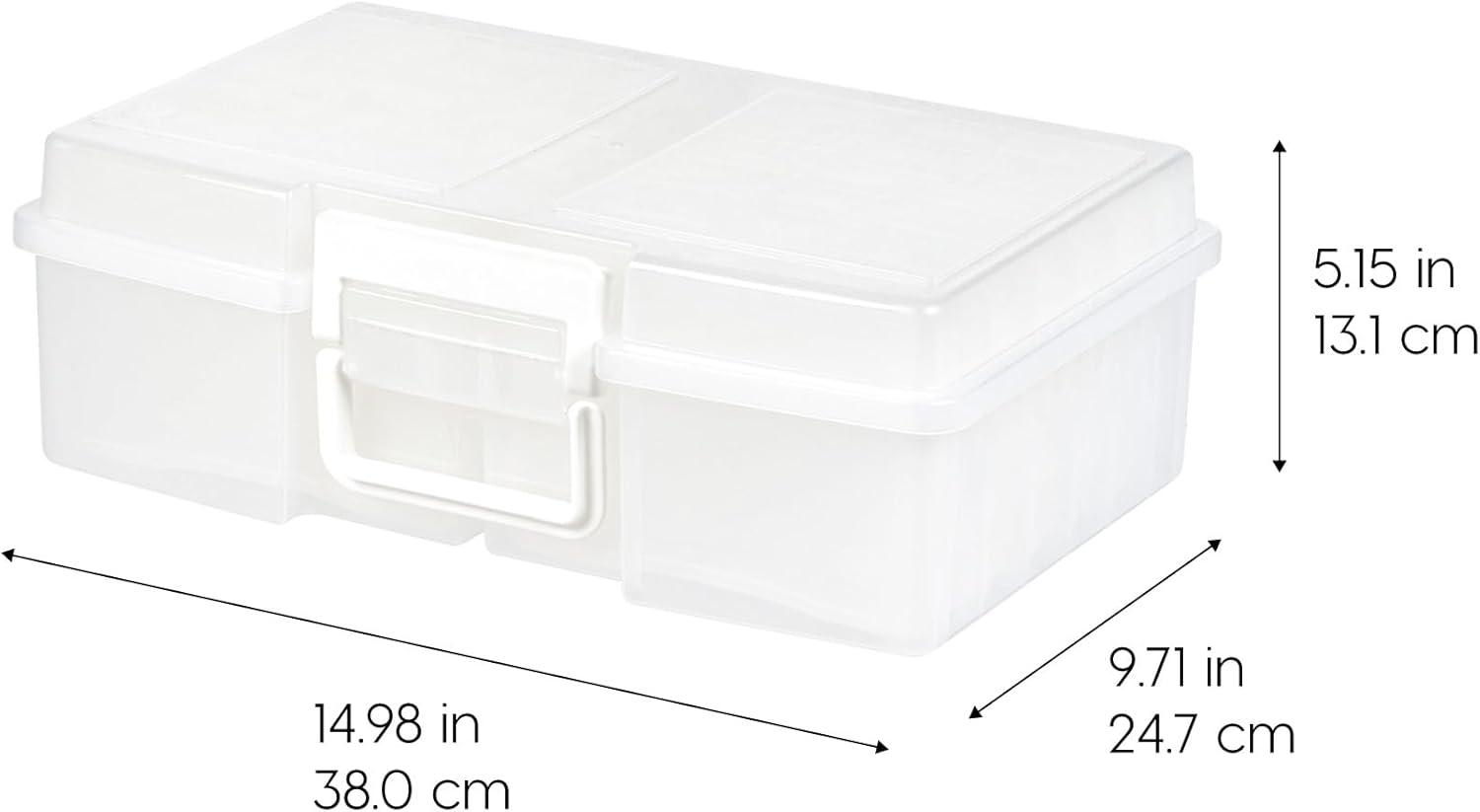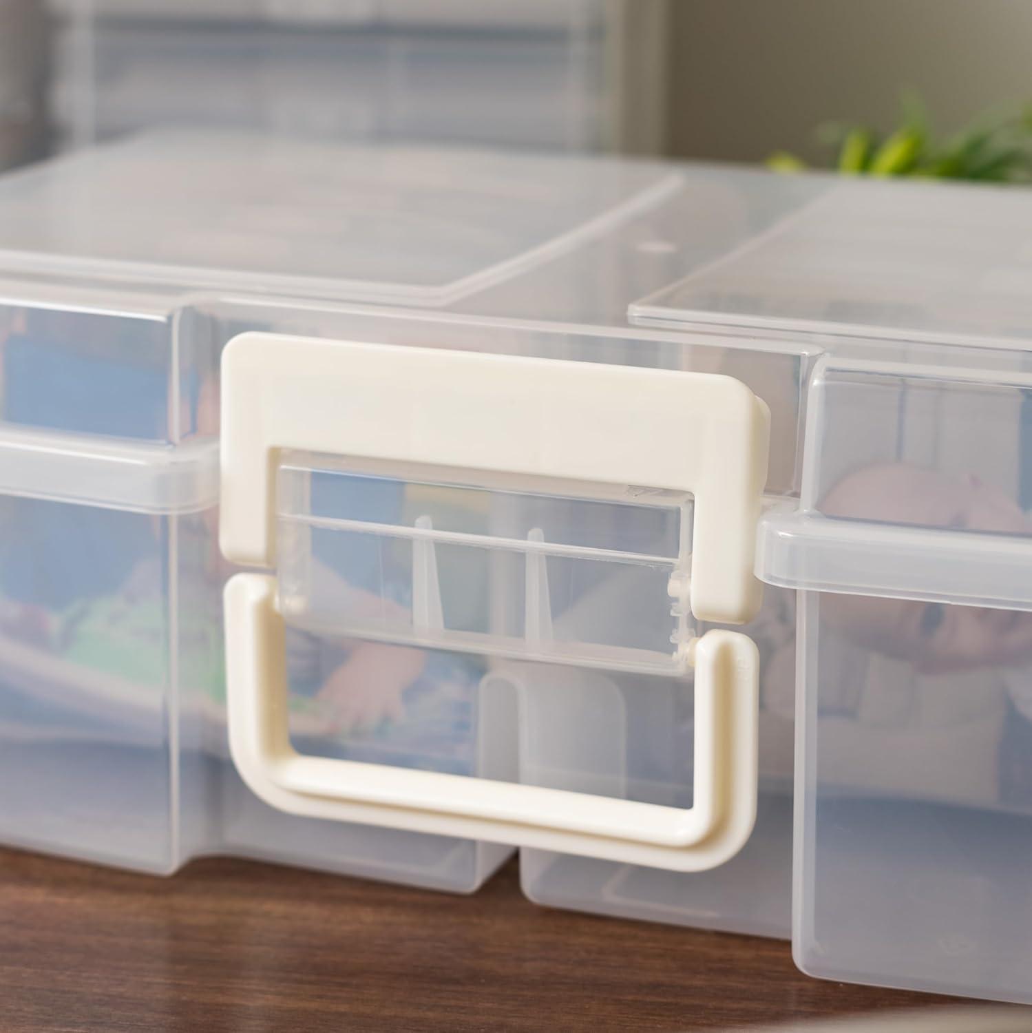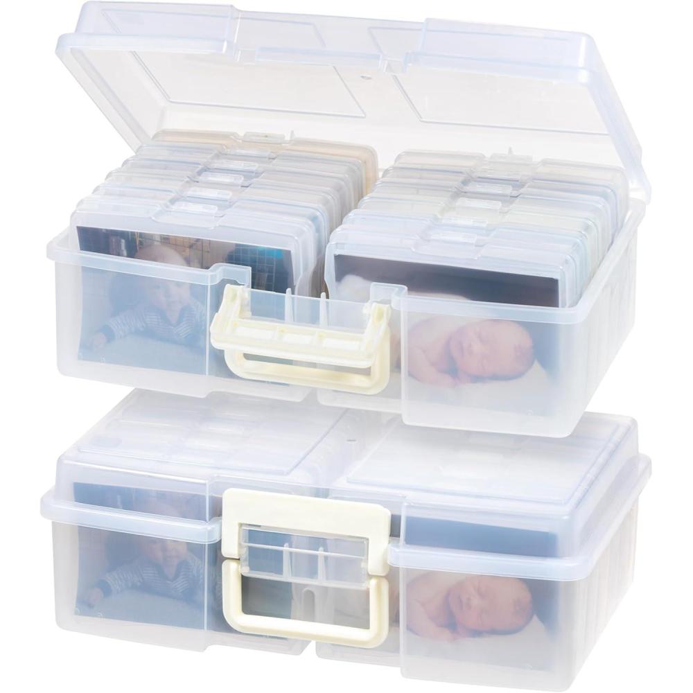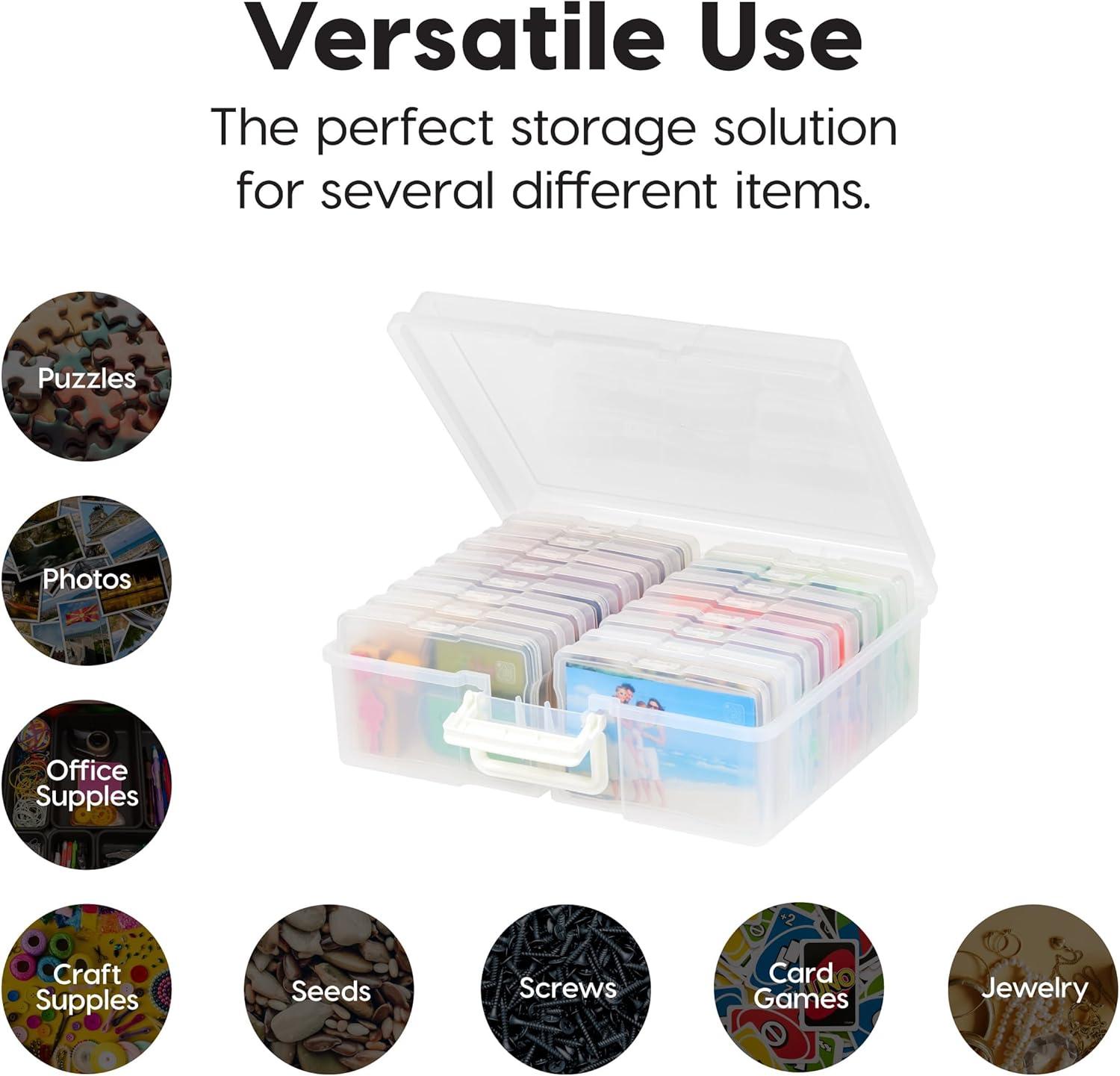 Organize, protect, and simplify your storage with this all-in-one WeatherPro IRIS USA photo and craft keeper, featuring multiple removable inner cases housed in a discreet, durable main container—perfect for storing photographs, scrapbooking supplies, craft embellishments, stationery, index cards, flashcards, seed packets, game pieces, stickers, and more; each inner case includes snap-tight closures to keep contents secure and rounded corners to protect delicate items, while the stackable outer container ensures easy portability, Weather resistant protection, and space-saving storage at home, or on the go; ideal for photographers, teachers, crafters, scrapbookers, and organizers of all kinds, this photo organizer and storage solution is made with high-quality, acid-free, BPA-free materials to preserve your items long-term without damage or fading; whether you're sorting keepsakes, organizing craft supplies, or managing office materials, this clear photo box storage system provides the flexibility and protection you need to stay organized with ease.