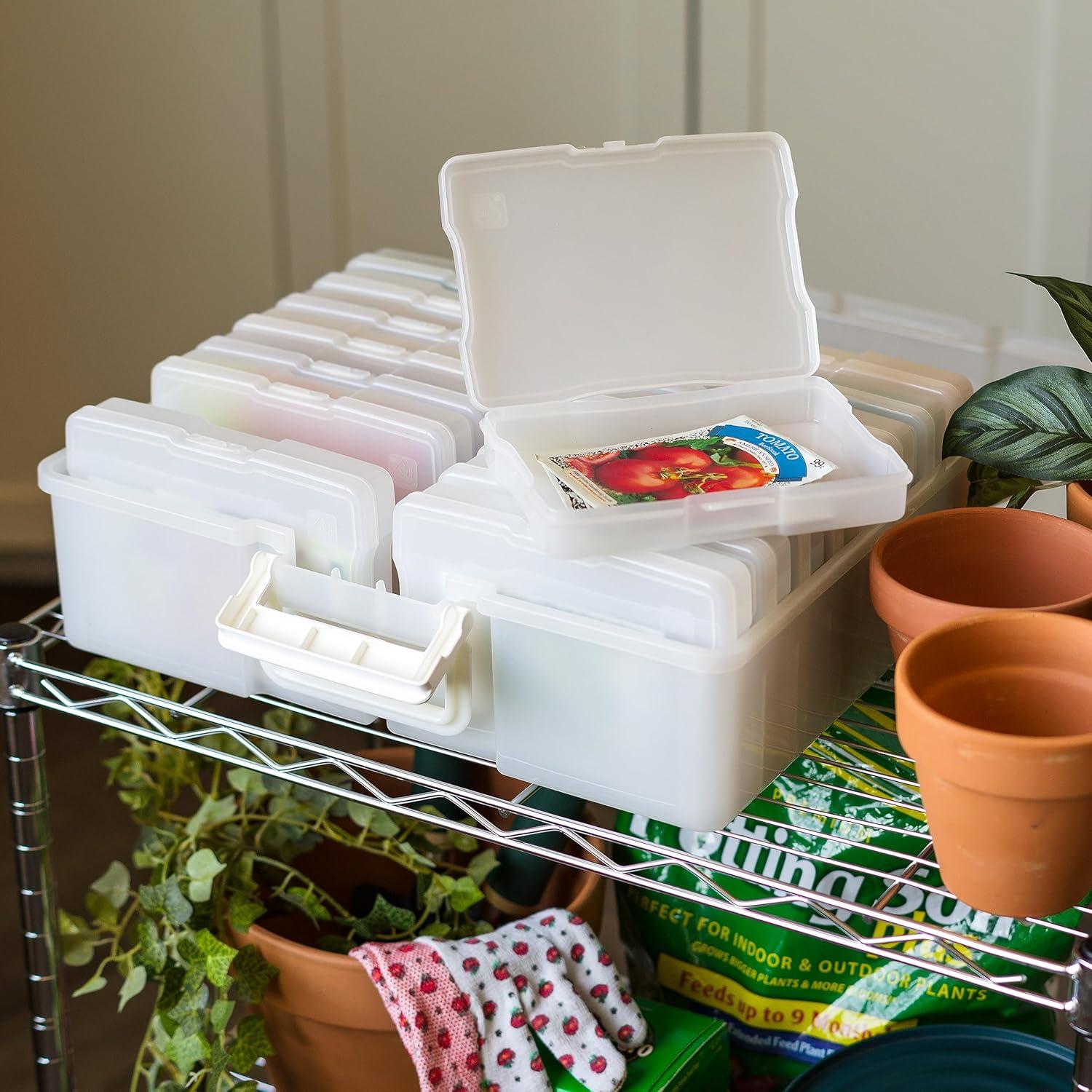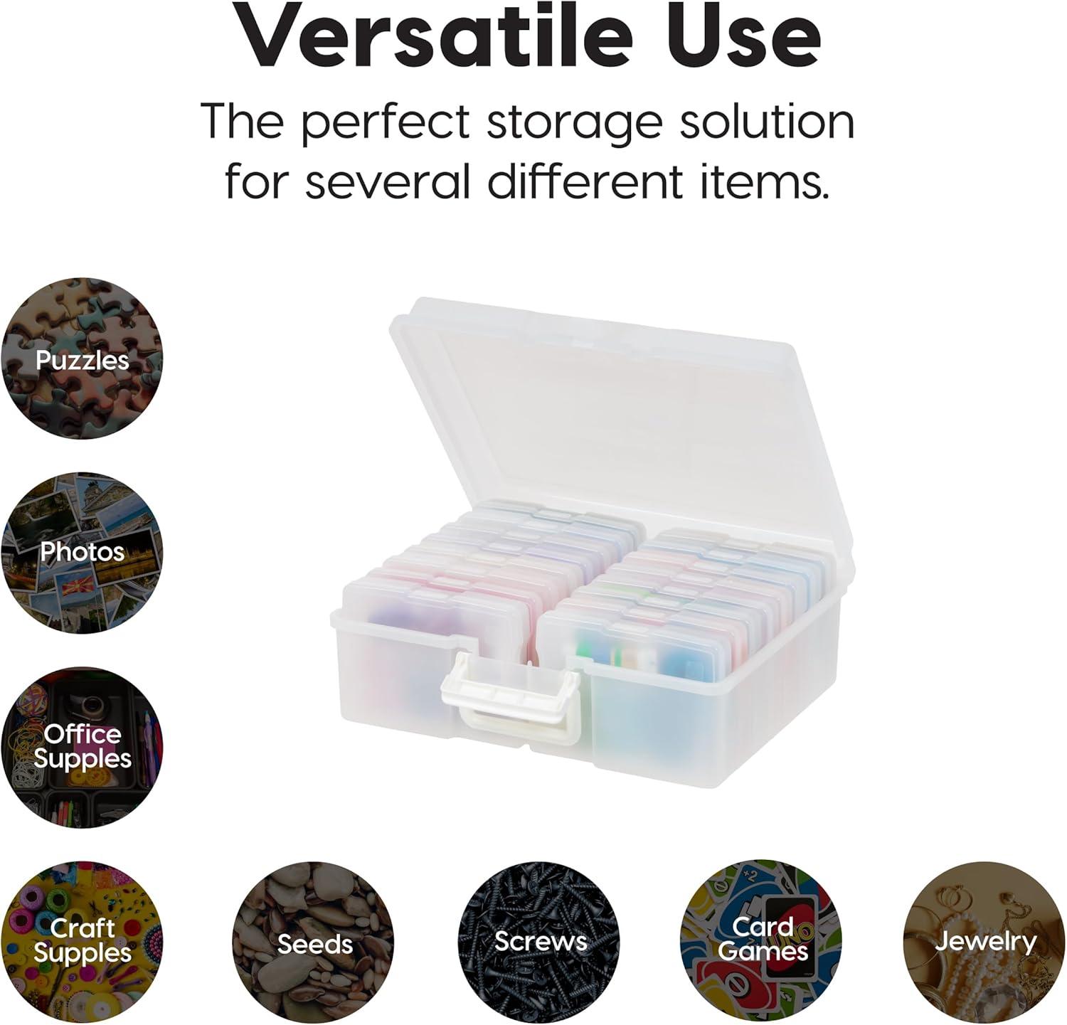 Organize, protect, and simplify your storage with this all-in-one WeatherPro IRIS USA photo and craft keeper, featuring multiple removable inner cases housed in a discreet, durable main container—perfect for storing photographs, scrapbooking supplies, craft embellishments, stationery, index cards, flashcards, seed packets, game pieces, stickers, and more; each inner case includes snap-tight closures to keep contents secure and rounded corners to protect delicate items, while the stackable outer container ensures easy portability, Weather resistant protection, and space-saving storage at home, or on the go; ideal for photographers, teachers, crafters, scrapbookers, and organizers of all kinds, this photo organizer and storage solution is made with high-quality, acid-free, BPA-free materials to preserve your items long-term without damage or fading; whether you're sorting keepsakes, organizing craft supplies, or managing office materials, this clear photo box storage system provides the flexibility and protection you need to stay organized with ease.