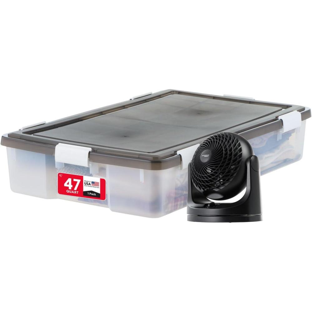 COMFORT & ORGANIZATION: This IRIS USA bundle pairs a whisper-quiet WOOZOO oscillating desk fan with a WeatherPro 47 Qt underbed storage bin—ideal for full-room airflow and secure storage in bedrooms, dorms, or offices.